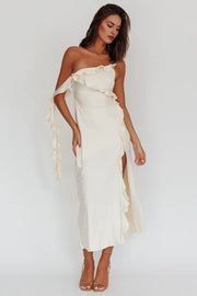 Casual One shoulder Ruffle Satin Butter Midi Evening Dress With Slit For Women
