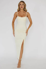 Casual Spaghetti Straps Piping Trim Butter Midi Evening Dress With Side Slit is a charming choice for evening events. It features delicate spaghetti straps that offer a feminine and elegant look. The piping trim adds a touch of sophistication and visual interest, enhancing the dress's overall style. The side slit allows for graceful movement and adds an alluring element. Crafted in a lovely butter hue, this midi dress exudes elegance and freshness.