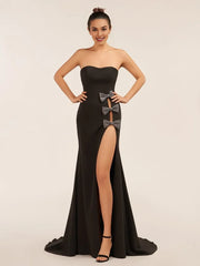 Elevate your evening glamour with this Elegant Mermaid Sweetheart Bow Black Prom Dress With Sweep Train. It features a charming sweetheart neckline, a mermaid silhouette, and sparkling bow detailing along the thigh-high slit for playful elegance, all crafted in timeless black. The sweep train adds sophistication, while the lace-up back ensures a tailored fit.