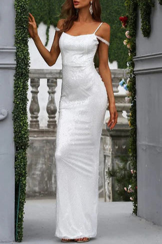 Exquisite tailoring White Sequin Spaghetti Strap Mermaid Long Formal Dress