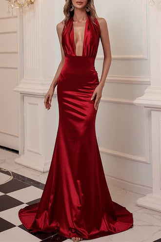 Full of charm Burgundy Halter Backless Mermaid Long Evening Dress - US 2 / UK 6 / EU 32