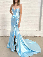 Full of charm Simple V Neck Mermaid Blue Long Formal Evening Dresses
