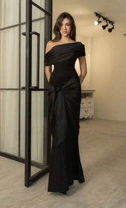 Elevate your evening glamour with this Mermaid Off-The-Shoulder Satin Black Long Mermaid Party Dress Prom Dress. It features a chic off-the-shoulder design, luxurious satin fabric, and a mermaid silhouette that hugs the curves before flaring at the hem. The dramatic side bow detail adds a touch of sophistication, while the long length ensures elegance.