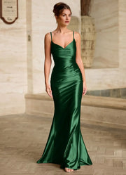Elevate your evening glamour with this Mermaid Spaghetti Straps Backless Lace-up Dark Green Full Length Prom Dress. It features delicate spaghetti straps, a mermaid silhouette crafted from luxurious satin in a rich dark green hue, and a backless design with intricate lace-up detailing for allure. The full-length cut ensures elegance, while the satin texture adds opulence.