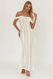 Off-Shoulder Tie Lace Cream Maxi Evening Dress With Subtle Train - Cream / US 2 / UK 6 / EU 32