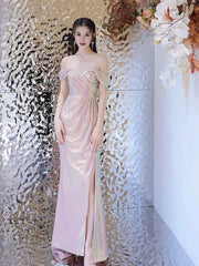 Elevate your evening glamour with this Shiny Mermaid Off The Shoulder Sequin Pink Long Evening Dress Prom Dress. It features a chic off-the-shoulder neckline, a mermaid silhouette that hugs the curves, and all-over iridescent sequins for a dazzling, eye-catching effect. The pink hue is romantic, while the high slit adds a touch of allure.