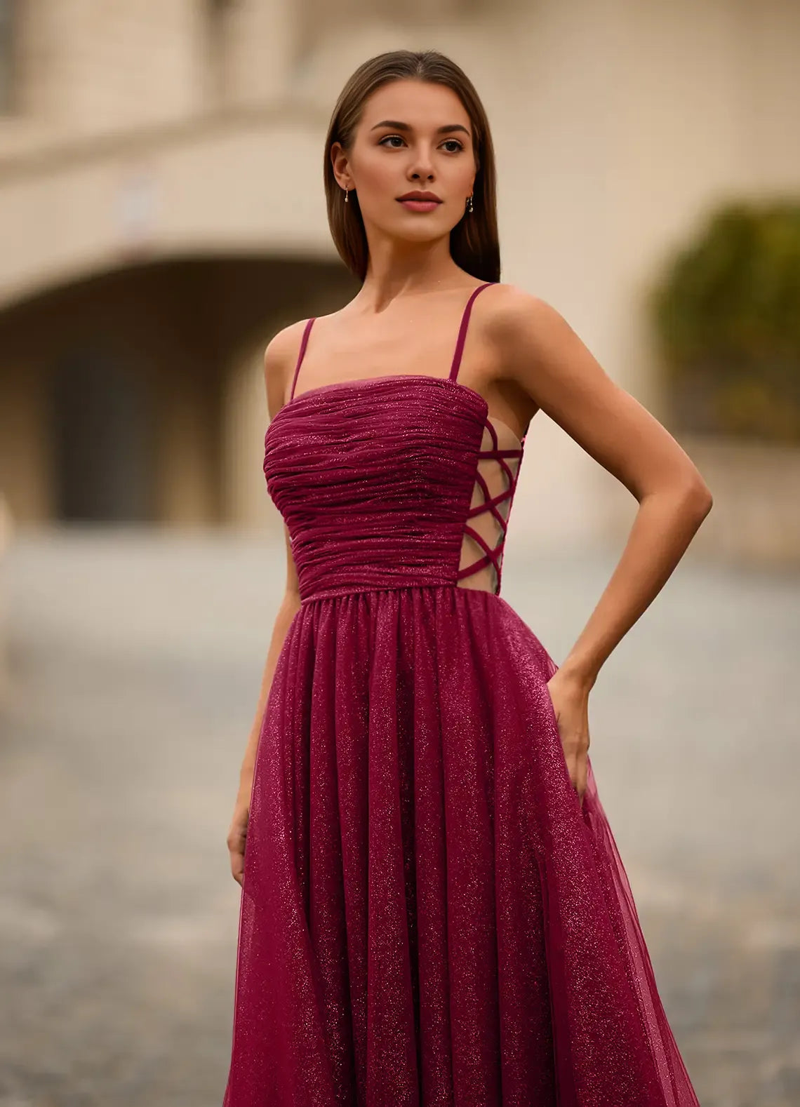 Elevate your evening glamour with this Shiny Spaghetti Straps Sheer Pleated Tulle Burgundy Full Length Prom Dress. It features delicate spaghetti straps, a ruched bodice, and a full-length skirt crafted from sheer, glittering tulle in a rich burgundy hue. The pleated detailing adds texture, while the side lace-up design offers a touch of allure.
