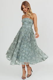Strapless Palm Tree Embellished Lace Sage Midi Evening Dress Prom Dress