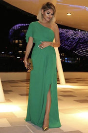 This elegant chiffon bridesmaid dress features a one-shoulder design with short sleeves, offering a modern yet graceful silhouette. The long length and side slit add a touch of sophistication and ease of movement, making it ideal for weddings and formal events. Crafted from lightweight chiffon, it ensures comfort throughout the day and evening. Perfect for bridesmaids or prom attendees seeking a refined and stylish look.