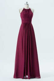 Burgundy Chiffon Round Neck Open Back Ruffle Pleated Full Length Dress Bridesmaid Dress