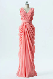 Coral Pink Chiffon Pleated V Neckline Wrap Banded Waist Full Length Zipper Bridesmaid Dress