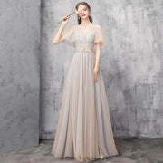 Fairy Tulle V Neck Short Sleeves Corset Floor Length Tulle Prom Dress Bridesmaid Dresses With Beaded