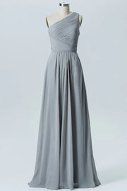 Grey Chiffon Pleated One-Shoulder Full Length Bridesmaid Dress Grey Evening Dress