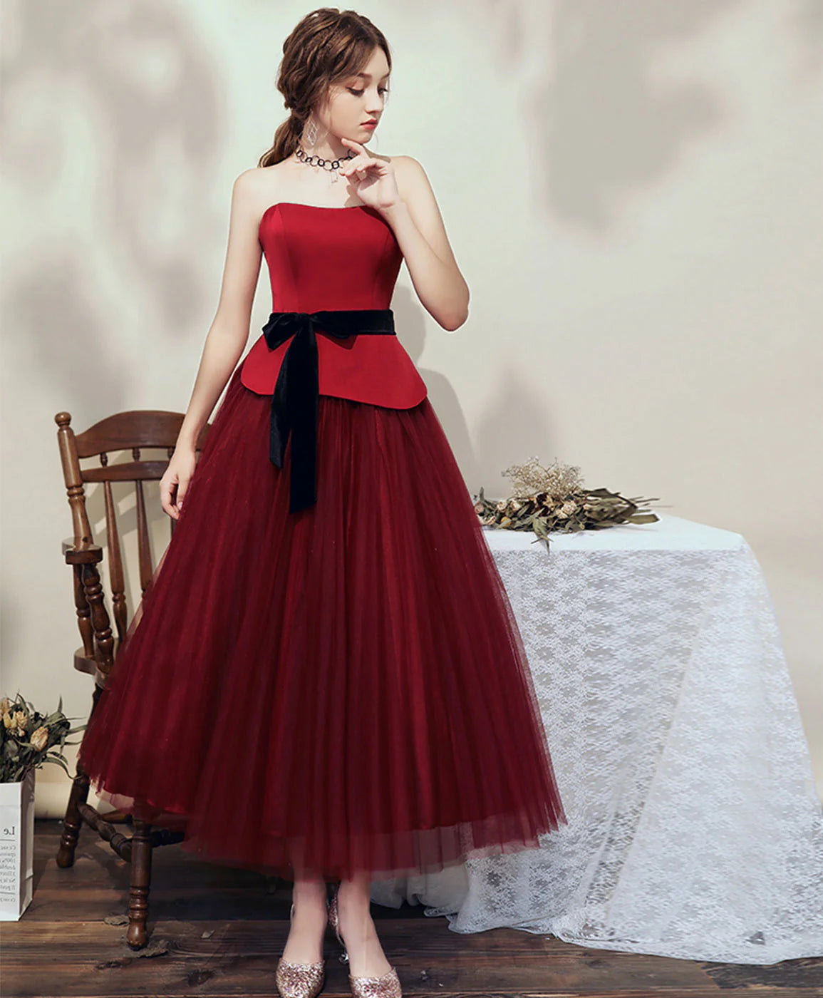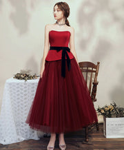 Simple Burgundy Tulle Tea Length Short Prom Dress Full of charm Bridesmaid Dress