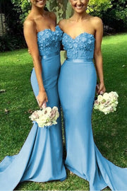 Smoky Blue Lace Mermaid Sweetheart Bridesmaid Dresses 3D Flowers Embroidery Prom Dress