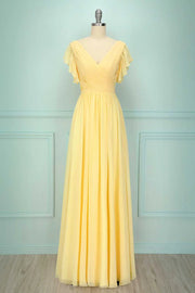 Yellow Tulle V-Neck Ruffled Pleated Bridesmaid Dress