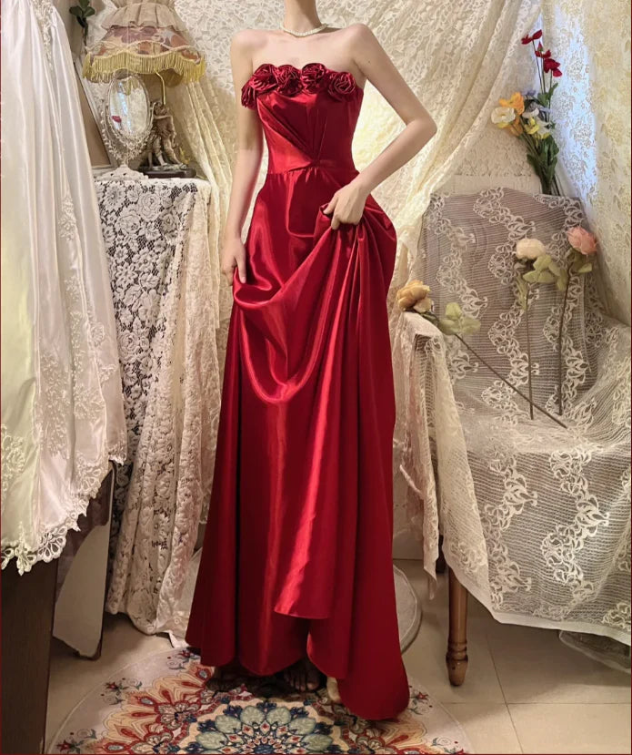 This elegant red satin evening dress features a strapless neckline and a flattering A-line silhouette. The three-dimensional rose detailing adds a sophisticated, artistic touch, making it perfect for prom or formal occasions. Its long length enhances a graceful presence, combining classic style with modern design for a standout look.