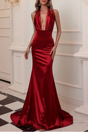 This elegant burgundy satin evening dress features a halter neck and a mermaid silhouette that flatters your figure. The open back design adds a touch of allure, while the floor-length cut with a graceful train ensures a stunning presence at any formal event. Crafted from smooth satin, this dress combines sophistication with comfort for unforgettable occasions.