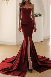 Burgundy Strapless Side Slit Off Shoulder Mermaid Long Evening Dress