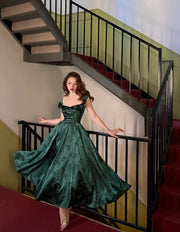 Charming A Line Strap Print Flower Green Satin Long Evening Dress
