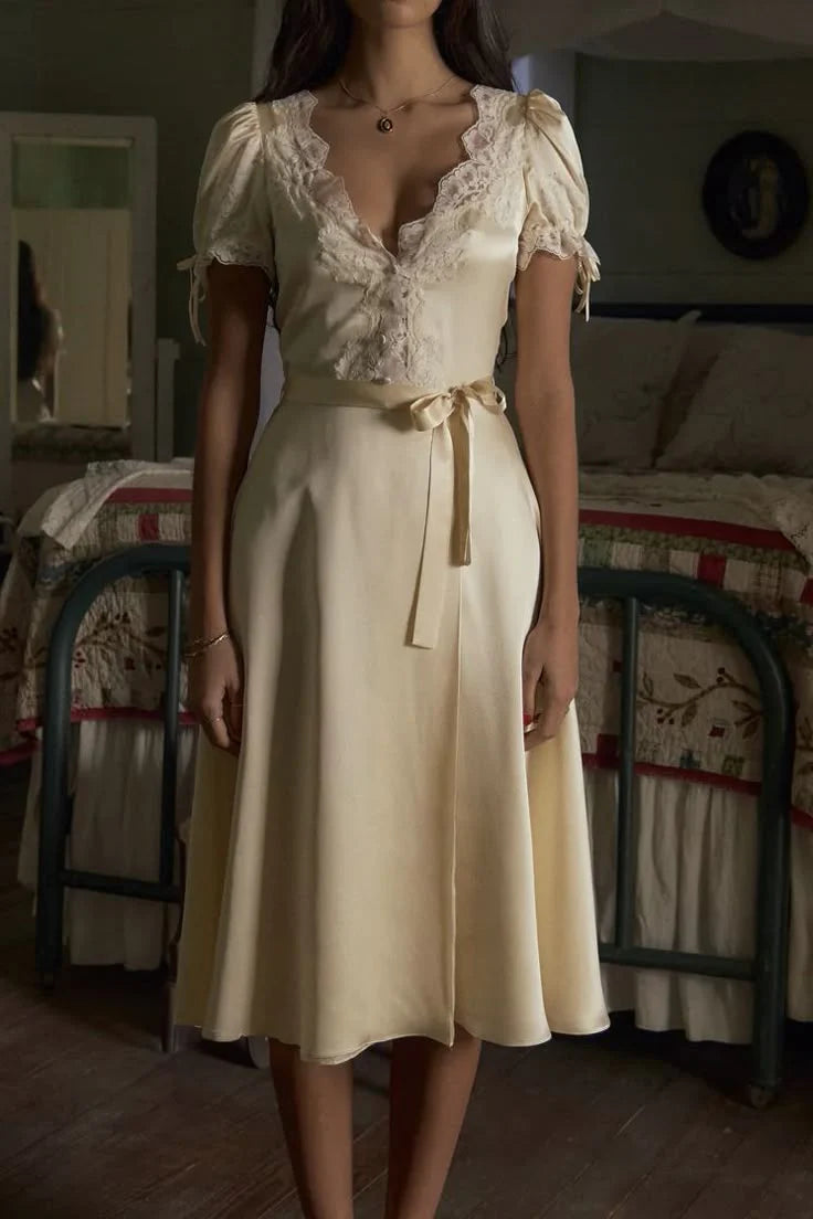 Cute A Line Puff Sleeve Lace Light Champagne Satin Prom Dress - US 2 / UK 6 / EU 32