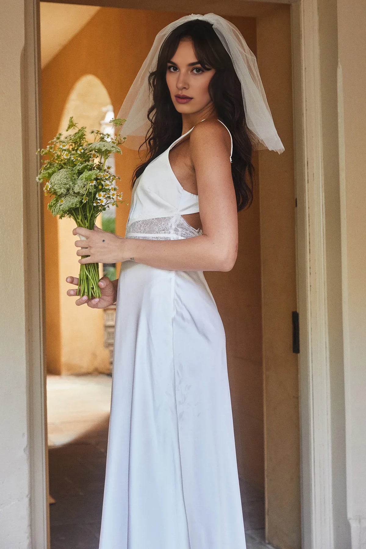 Lace Trim Cutout White Maxi Gown any accessories in the pictures are not included, Dressing occasion:evening events, proms, wedding, or other formal gatherings