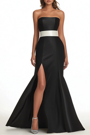 This elegant black satin evening dress features a sleeveless, strapless design that highlights the shoulders and neckline. Its mermaid silhouette contours the body for a flattering fit, while the long length and side slit add a touch of sophistication and ease of movement. Perfect for prom or formal occasions, this dress combines classic style with modern elegance.