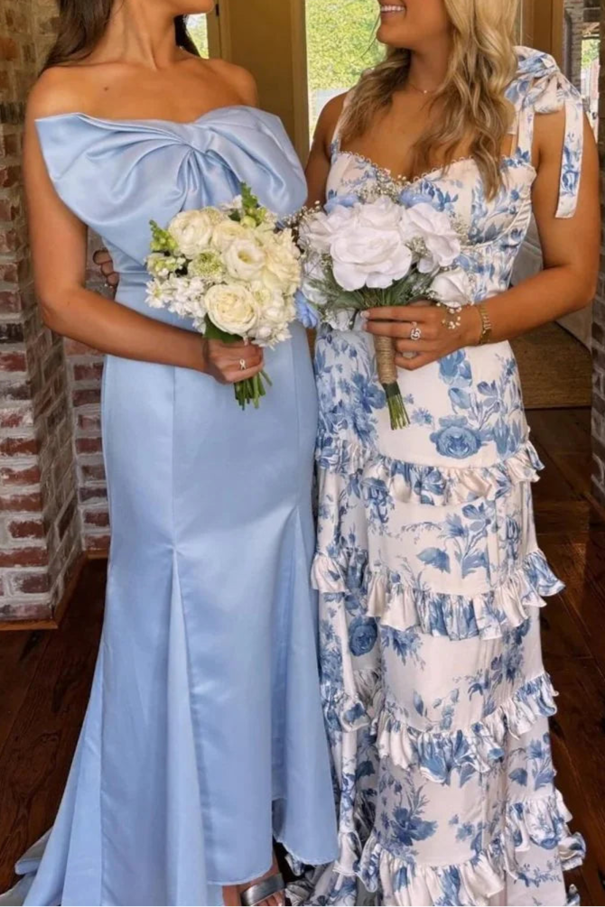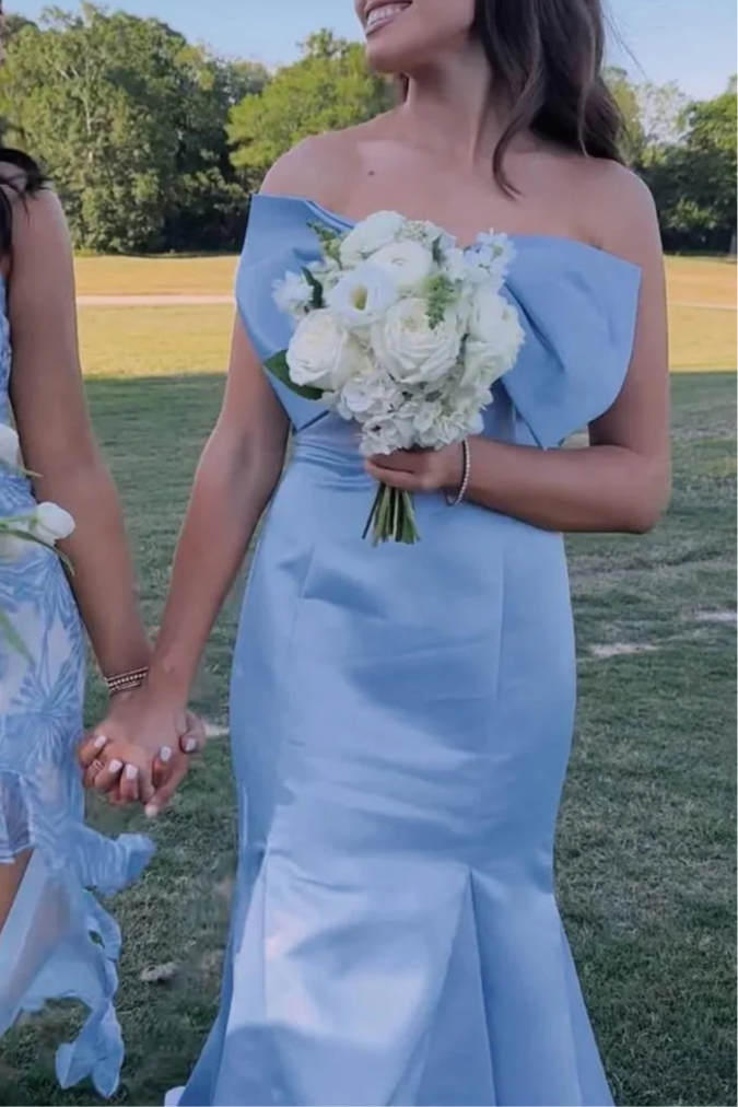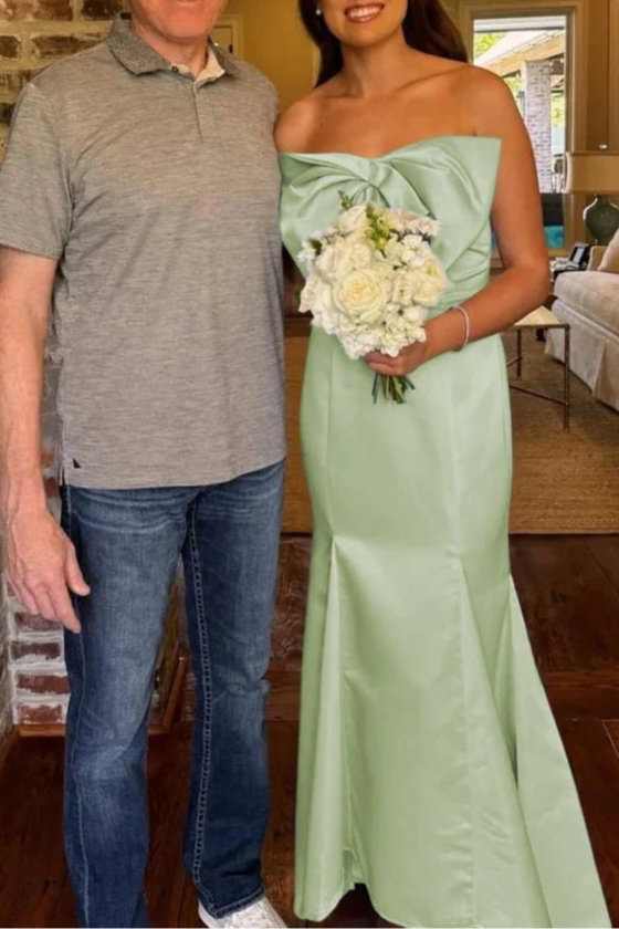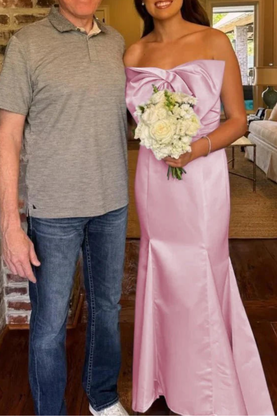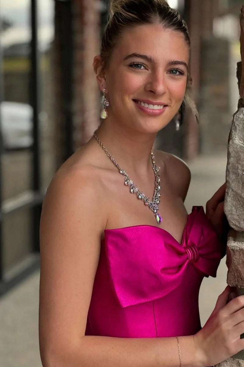 This fuchsia satin evening gown features a strapless, mermaid silhouette that elegantly contours the body. The standout bow detail adds a sophisticated touch, while the sweep train enhances its formal appeal. Crafted from smooth satin, this long dress offers a luxurious feel and a striking presence for special occasions.