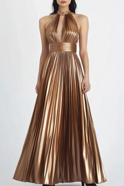Elevate your evening look with this Gold Metallic Satin A-Line dress, featuring a pleated design and a sophisticated halter neckline with tasteful cut-outs. The full-length silhouette combines elegance with modern style, making it an ideal choice for prom or formal events. Crafted from lustrous satin, this dress offers a flattering fit and a radiant finish that catches the light beautifully.