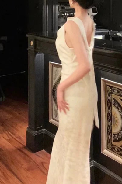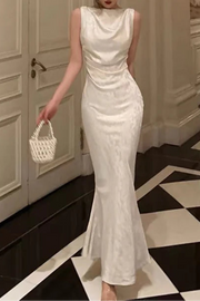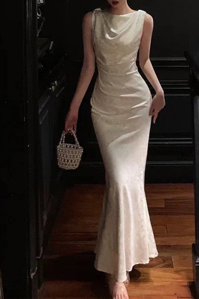 This elegant white satin evening dress features a flattering mermaid silhouette that enhances your figure with a graceful drape. The floral detailing adds a delicate touch, while the draped collar offers a sophisticated neckline perfect for formal occasions. Designed for comfort and style, this long prom dress is ideal for making a memorable impression at any special event.