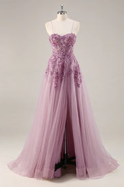 Grey Purple Beaded Spaghetti Straps Corset Applique Long Prom Dress Evening Dress With Slit