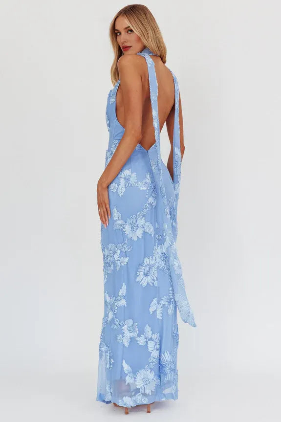 Halter Backless Floral Embellished Mesh Blue Maxi Evening Dress Party Dress