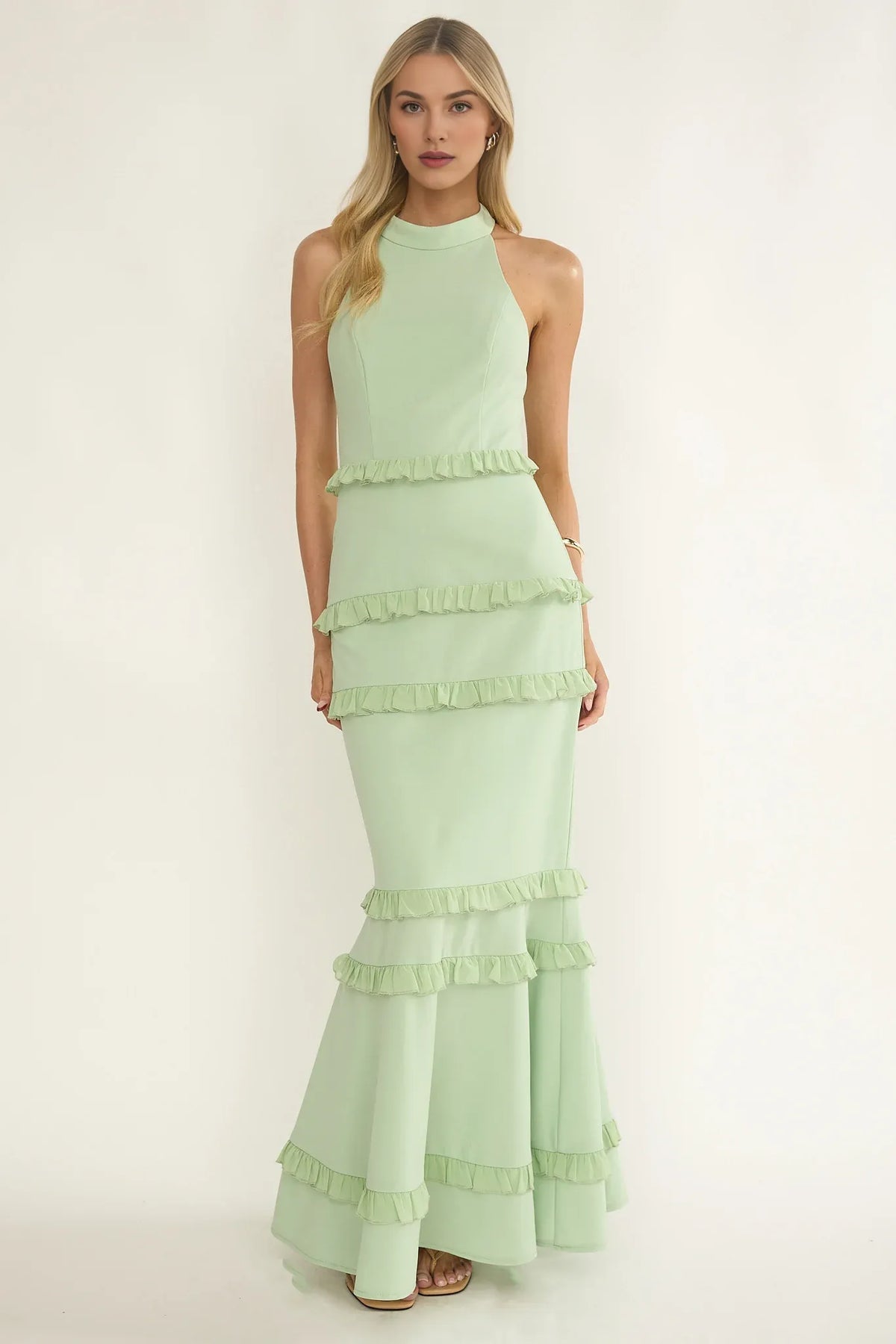 Elevate your evening elegance with this Halter Neck Frill Trim Open Back Sage Maxi Evening Dress For Women. It features a chic halter neck, delicate frill trims layered throughout for a romantic silhouette, and an alluring open back. The sage green hue is soft and sophisticated, while the maxi length ensures grace.