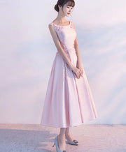 Pink Satin Lace Tea Length Prom Dress, Full of charm Evening Dress