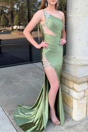 Sage Green Satin Beaded Mermaid One Shoulder Slit Long Prom Dress Evening Dress With Train