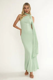 Elevate your evening style with this Scarf Neck One-Shoulder Mint Maxi Evening Dress. The distinctive scarf neck gracefully drapes over one shoulder, merging elegance with a playful flair—the long streamer flows smoothly as you move, bringing dynamic charm to every step. Made from soft, lightweight fabric in a refreshing mint shade, the dress has a fitted bodice that flatters your figure and a floor-length maxi skirt that radiates sophistication.