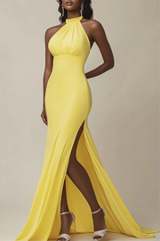 This elegant yellow satin evening dress features a halter neckline and a flattering mermaid silhouette that enhances your figure. The long design with a tasteful slit adds a touch of sophistication and ease of movement, making it perfect for prom or formal events. Crafted from smooth satin, it offers a luxurious feel and radiant shine for a standout look.