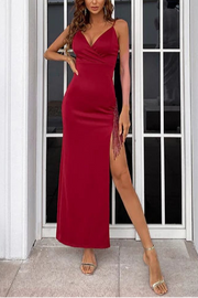 Unique design Burgundy V-Neck Fringe Side Slit Backless Long Evening Dress