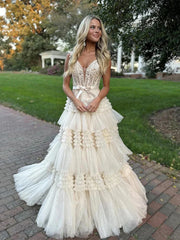 Unique design V Neck Layered Lace Champagne Formal Evening Dresses with Train