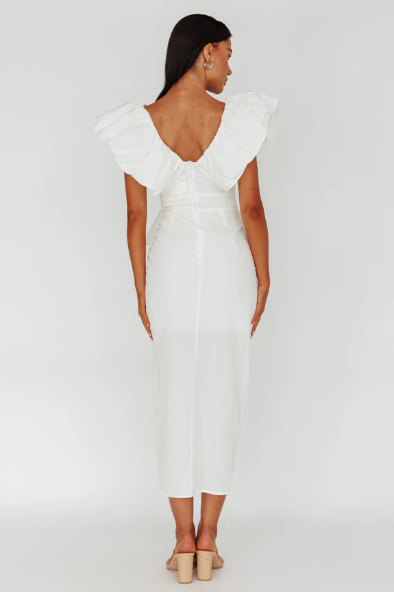 Elevate your evening style with this V Neck Flying Sleeves Ruffle Wrap Green Midi Evening Dress. The V-neckline adds allure, while flying sleeves with ruffle details bring a dramatic, romantic touch. The wrap design cinches the waist, and a side slit ensures ease of movement. Crafted in a rich green hue, the midi length balances sophistication and modernity.