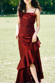 Elevate your evening look with this vintage-inspired burgundy chiffon dress, featuring delicate spaghetti straps and a flattering high-low hemline. The soft ruffles add graceful movement and dimension, making it an ideal choice for prom or formal occasions. Crafted from lightweight chiffon, this dress offers both elegance and comfort throughout your event.