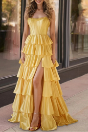 Yellow Satin Strapless Ruffle Tiered Beaded Corset A Line Prom Dresses Evening Dresses