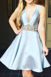A-Line Sexy Short Prom Dress V-neck Light Blue Satin Homecoming with Beading