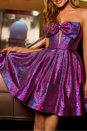 This dark purple metallic homecoming dress features a strapless, A-line silhouette with a flattering cut-out corset design. The short length and elegant bow detail add a playful yet sophisticated touch, making it an ideal choice for a memorable evening. Its structured fit enhances your shape while the metallic fabric catches the light beautifully, ensuring you stand out with confidence and style.