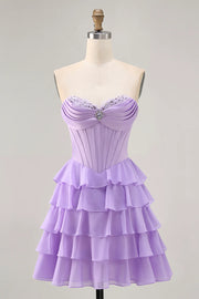 Beautiful Purple Sweetheart Collar Strapless Pleated Tiered Corset A Line Short Homecoming Dress - Purple / US 2 / UK 6 / EU 32