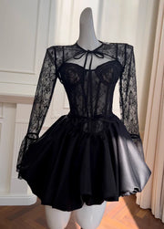 Black A-line Neck Lace Satin Short Prom Dress, Sweetheart Homecoming Dress