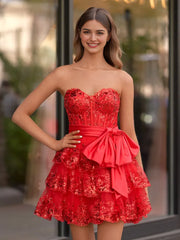 Black Corset Sequin Appliques Sweetheart Collar Tiered Short Homecoming Dress With Bow - Red / US 2 / UK 6 / EU 32