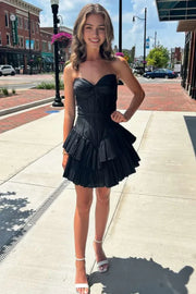 Black Satin Sweetheart Collar Strapless A-Line Layered Sleeveless Pleated Short Homecoming Dress
