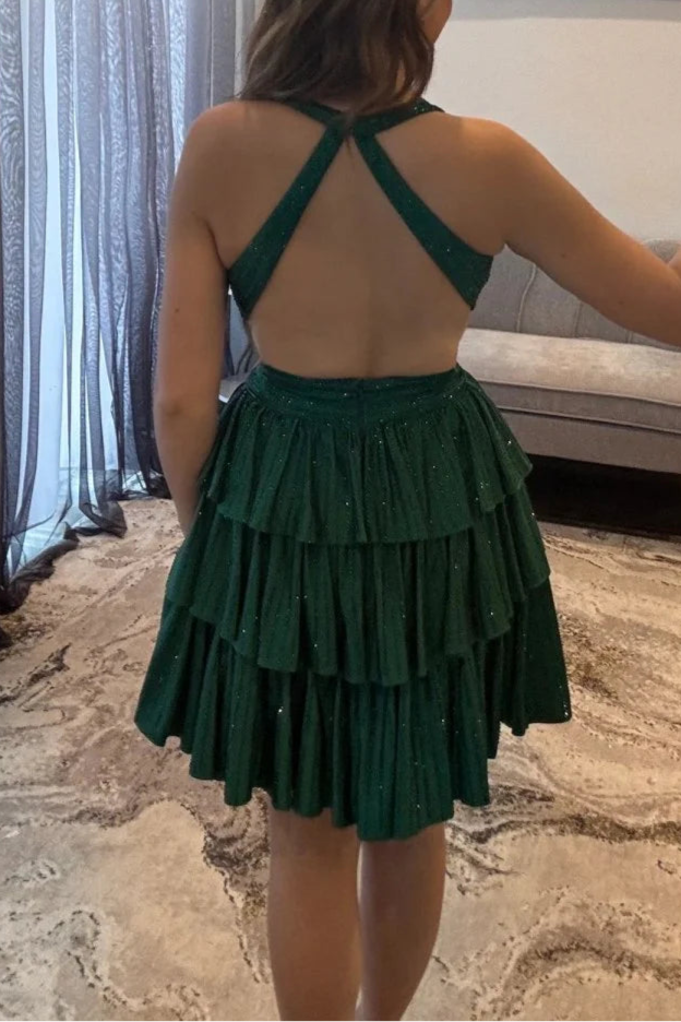 This sky blue satin homecoming dress features a halter neckline with a flattering V-cut, complemented by elegant cut-out details. Its tiered A-line silhouette offers a graceful, flowing shape, while delicate beading adds a refined touch of sparkle. The short length makes it perfect for dancing and celebrating in style. Crafted to combine sophistication with youthful charm, this dress is an excellent choice for memorable occasions.