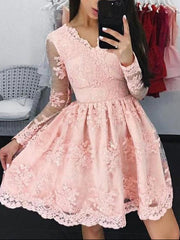Bridelily A-Line Lace Long Sleeves V-neck Short Homecoming Dresses With Applique